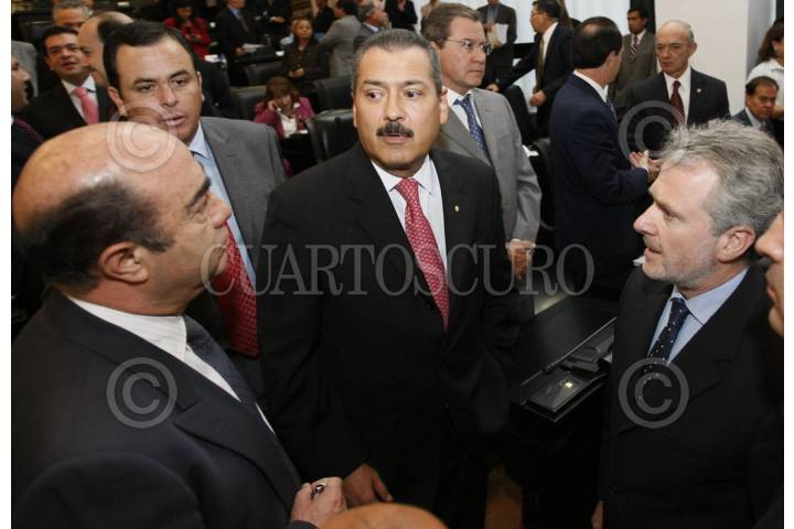 MÉXICO, D.F., 10ABRIL2008.- Los senadores Jesús Murillo Karam, Manlio Fabio Beltrones, coordinador de los senaodes del PRI y Santiago Creel, Presidente de la Mesa Directiva del Senado, discuten sobre el curso de la sesión luego de que la tribuna fuera tomada por los senadores del Frente Amplio Progresista. FOTO: IGANCIO GONZÁLEZ/CUARTOSCURO.COM