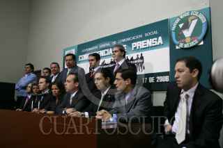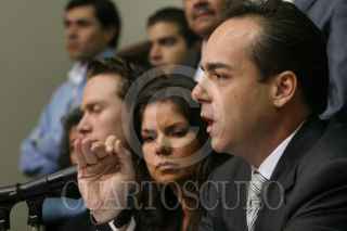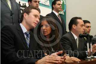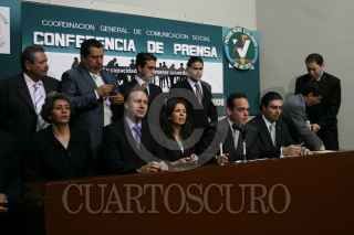 MÉXICO D.F. 17ABRIL2008.-Diputados y senadores del Partido Verde Ecologista acudieron a la Cámara de Diputados para dar un conferencia a los medio donde dieron a conocer su postura de rechazó a las limitantes a la libertada de expresión y la desigualdad en el Derecho de Réplica.En la imagen el senador Manuel Velazco y la diputada Gloria Lavara. FOTO: GUILLERMO PEREA /CUARTOSCURO.COM