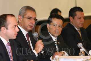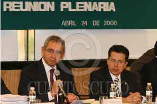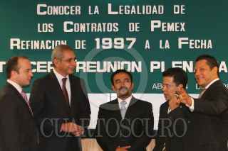 MÉXICO D.F. 24ABRIL2008.-Salvador Vega Casillas, Secretario de la Función Pública acudio esta mañana a la Cámara de Diputados donde comparecio ante la "Comisión Especial de Investigción de los Contratos de PEMEX Refinación de 1997 a la Fecha".En la imagen es acompañado por los diputados, Antonio Valladolit, Armando García, Xavier López Adame y Miguel Angel Jiménez. FOTO: GUILLERMO PEREA / CUARTOSCURO.COM