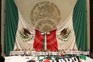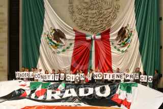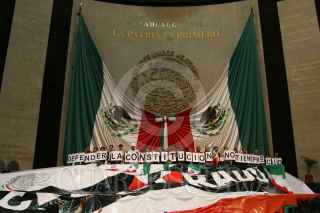 MÉXICO D.F. 14ABRIL2008.-Diputados integrantes de la FAP realizan la frase del día con la leyenda "Defender la Constitución no tiene Precio".esto en salón de plenos que mantienen tomado desde hace 15n días. FOTO: GUILLERMO PEREA /CUARTOSCURO.COM