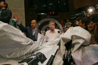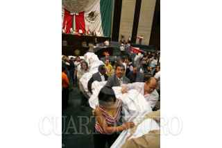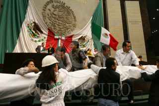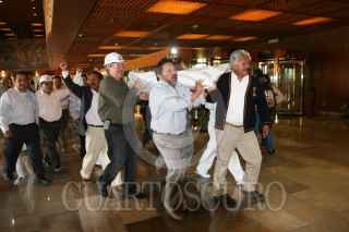 MÉXICO D.F. 24ABRIL2008.-Diputados integrantes de la FAP, quitan la manta monumental que mantenia la leyenda ¨Clausurado" en el Salón de Plenos de la Cámara de Diputados el cual desalojaron después de 16 días de la toma de la tribuna por la Reforma Energética propuesta por el presidente Felipe Calderón. FOTO: GUILLERMO PEREA /CUARTOSCURO.COM