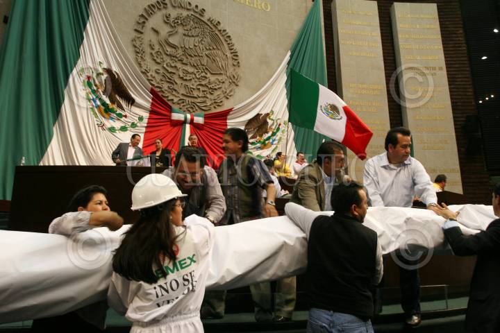 MÉXICO D.F. 24ABRIL2008.-Diputados integrantes de la FAP, quitan la manta monumental que mantenia la leyenda ¨Clausurado" en el Salón de Plenos de la Cámara de Diputados el cual desalojaron después de 16 días de la toma de la tribuna por la Reforma Energética propuesta por el presidente Felipe Calderón. FOTO: GUILLERMO PEREA /CUARTOSCURO.COM