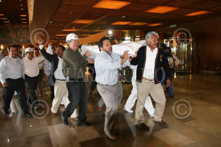 MÉXICO D.F. 24ABRIL2008.-Diputados integrantes de la FAP, quitan la manta monumental que mantenia la leyenda ¨Clausurado" en el Salón de Plenos de la Cámara de Diputados el cual desalojaron después de 16 días de la toma de la tribuna por la Reforma Energética propuesta por el presidente Felipe Calderón. FOTO: GUILLERMO PEREA /CUARTOSCURO.COM