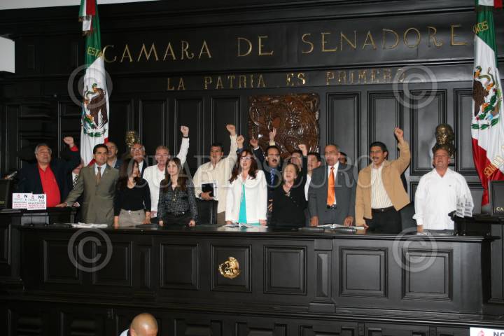 MÉXICO D.F. 25ABRIL2008.-Senadores integrantes de a FAP, desalojarona la tribuna que mantenian tomada desde hace 16 días, después de llegar a un acuerdo para el debate de la Reforma Energética. FOTO: GUILLERMO PEREA /CUARTOSCURO.COM