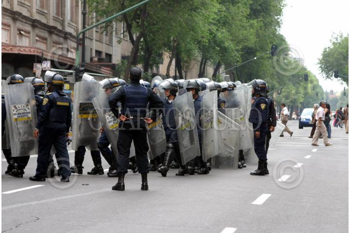 MÉXICO, D.F., 30ABRIL2008.- Policías del agrupamiento de granaderos de la SSP realizaron un paro de labores y marcharon del sector Balbuena hasta el Zócalo para demandar la homologación de sueldo y prestaciones donde bloquearon la Avenida 20 de Noviembre, sus mismos compañeros granaderos los amagaron para que se retiraran. FOTO: PEDRO MARRUFO/CUARTOSCURO.COM