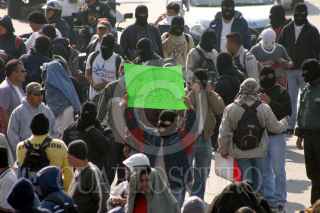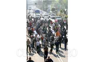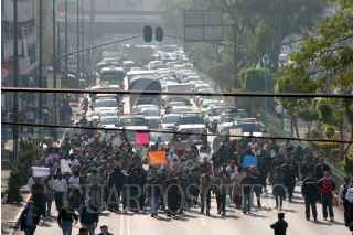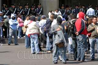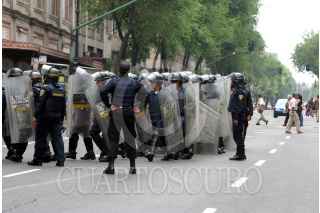 MÉXICO, D.F., 30ABRIL2008.- Policías del agrupamiento de granaderos de la SSP realizaron un paro de labores y marcharon del sector Balbuena hasta el Zócalo para demandar la homologación de sueldo y prestaciones donde bloquearon la Avenida 20 de Noviembre, sus mismos compañeros granaderos los amagaron para que se retiraran. FOTO: PEDRO MARRUFO/CUARTOSCURO.COM