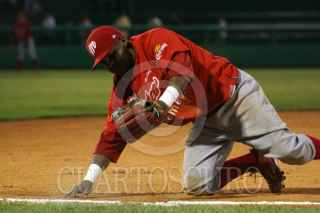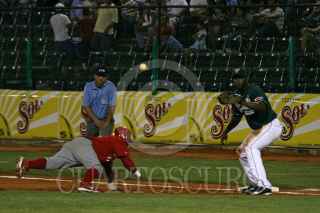 VILLAHERMOSA, TABASCO, 30ABRIL2008.- Acciones del segundo juego de la serie entre los Olmecas de Tabasco contra los Diablos Rojos del México que se celebra el Centenario del 27 de Febrero en donde los locales ganan una carrera a cero en el cierre de la tercer entrada. En la imagen el tercera base de la novena escarlata de origen panameño José Macias se lanza y atrapa la bola. FOTO: MARCO POLO GUZMÁN HERNÁNDEZ/CUARTOSCURO.COM