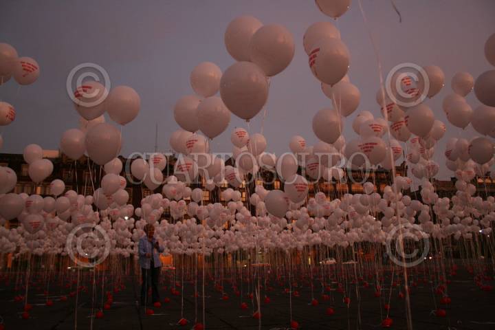 MÉXICO, D.F., 09MAYO2008.- Integrantes de pro-vida encabezados por Jorge Serrano Limon colocaron cientos de globos en la plancha del Zócalo de la ciudad y una manta con la imágen del jefe de Gobierno al mismo que rezaban y pedian por los legisladores que aprobaron la ley pro-aborto. FOTO: SÁSHENKA GUTIÉRREZ/CUARTOSCURO.COM