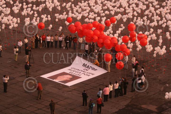 MÉXICO, D.F., 09MAYO2008.- Integrantes de pro-vida encabezados por Jorge Serrano Limon colocaron cientos de globos en la plancha del Zócalo de la ciudad y una manta con la imágen del jefe de Gobierno al mismo que rezaban y pedian por los legisladores que aprobaron la ley pro-aborto. FOTO: SÁSHENKA GUTIÉRREZ/CUARTOSCURO.COM