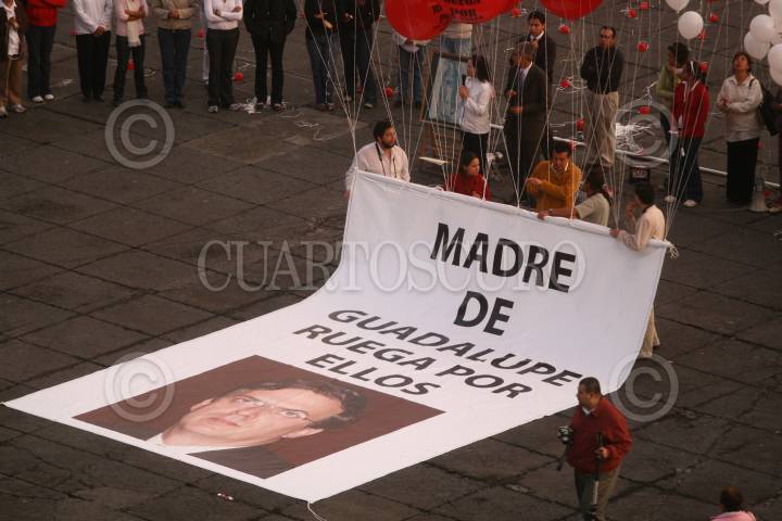 MÉXICO, D.F., 09MAYO2008.- Integrantes de pro-vida encabezados por Jorge Serrano Limon colocaron cientos de globos en la plancha del Zócalo de la ciudad y una manta con la imágen del jefe de Gobierno al mismo que rezaban y pedian por los legisladores que aprobaron la ley pro-aborto. FOTO: SÁSHENKA GUTIÉRREZ/CUARTOSCURO.COM