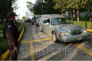MÉXICO, D.F., 09MAYO2008.- Una carroza fúnebre sale de las instalaciones de la Secretaria de Seguridad Pública Federal después de haberse realizado la ceremonia luctuosa en memoria de Edgar Eusebio Millán Gómez, coordinador general de seguridad regional de la Policía Federal y de los dos agentes de la corporación Alejandro González García y José López Álvarez. FOTO: RODOLFO ANGULO/CUARTOSCURO.COM