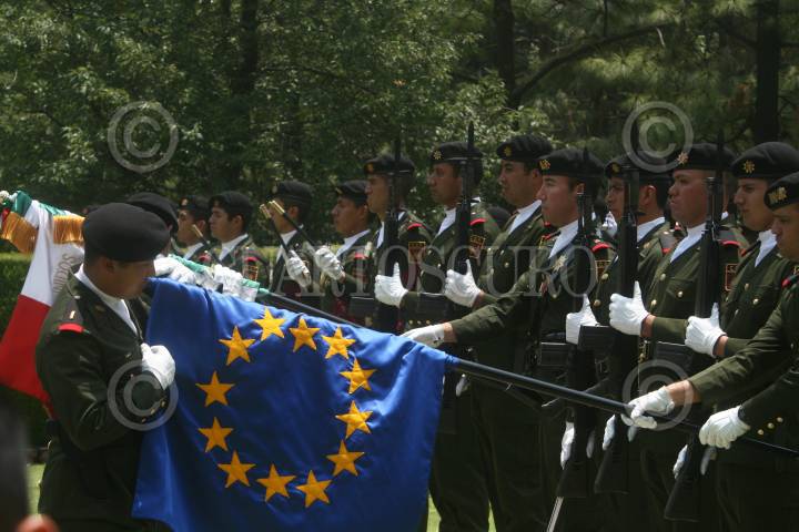 MÉXICO, D.F., 12MAYO2008.- Elementos del ejercito guardan las banderas de México e Unuión Europea al término de la ceremonia oficial de bienvenida a José Manuel Durao Barroso presidente de la comisión Europea, en el monumento a Francisco I madrero en la residencia oficial de los Pinos. FOTO: SÁSHENKA GUTIÉRREZ/CUARTOSCURO.COM