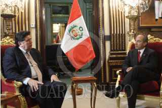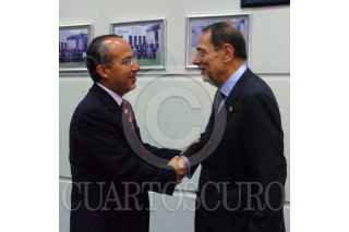 LIMA, PERU, 16 MAYO2008.- Felipe Calderón Hinojosa, Presidente de México saluda a Javier Solana, Secretario General del Consejo y Alto Representante para la Política Exterior y Seguridad Común de la Unión Europea, en el marco de la reunión de la V Cumbre de Jefes de estado y de Gobierno ALC-UE, que se realizó en en las instalaciones del TECde Monterrey Campus Lima. FOTO: ARIEL GUTIERREZ/CUARTOSCURO.COM