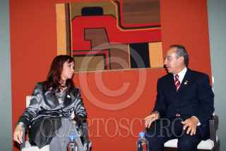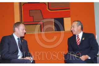 LIMA, PERU 16MAYO2008.-El presidente, Felipe Calderón dialoga con el primer ministro de la Republica de Polonia Donald Tusk, en el marco de la V Cumbre de Jefes de Estado y de Gobierno" que tuvo lugar en el Museo de la Nación. FOTO: ALFREDO GUERRERO/CUARTOSCURO.COM
