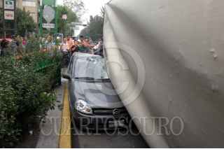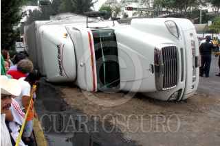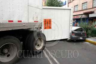 MÉXICO, D.F., 18MAYO2008.- Un trailer de doble remolque cargado con varias toneladas de refacciones de automoviles se volco al intentar dar la vuelta sobre el Eje de Guerrero y Mosqueta, aplastando con una de las cajas un coche tipo Chevy que se encontraba estacionado afortunademente no se reportaron ningún lesionado, integrantes del cuerpo de bomberos tardaron dos horas para despejar el área. FOTO: PEDRO MARRUFO/CUARTOSCURO.COM