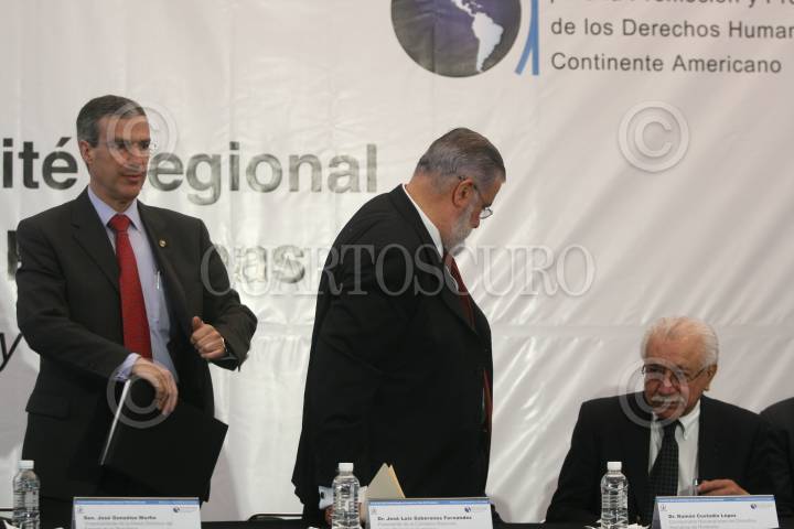 MÉXICO, D.F., 26MAYO2008.- José González Morfín Vicepresidente de la Mesa Directiva del Senado de la República , José Luis Soberanes, Ramón Custodio Comisionado Nacional para los Derechos Humanos en Honduras, durante la reunión de trabajo contra la trata de personas México, Centroamérica y el Caribe. FOTO:SÁSHENKA GUTIÉRREZ/CUARTOSCURO.COM
