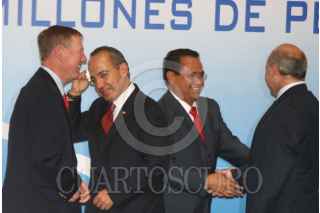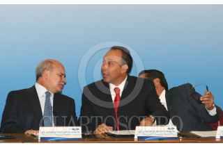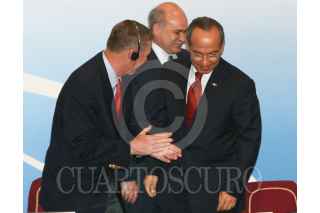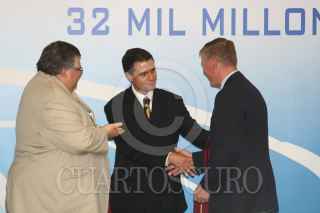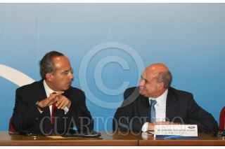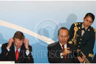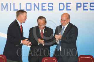 MÉXICO, D.F., 30MAYO2008.- Alaan Mullaly Presidente y director general de Ford Motor Company, Felipe Calderon Presidente de México y Eduardo Sojo secretario de economia en el salon Adolfo Lopez Mateos de la residencia oficial de los pinos donde se realizó los proyectos de inversión de Ford en México. FOTO: SÁSHENKA GUTIÉRREZ/CUARTOSCURO.COM