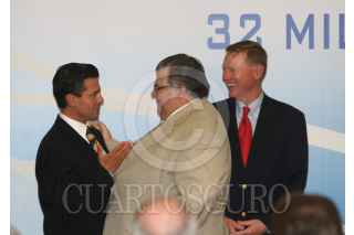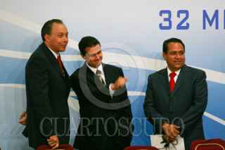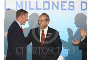 MÉXICO, D.F., 30MAYO2008.- Enrique Peña Nieto Gobernador del Estado de México, Agustin Carstens secretario de Hacienda , Alaan Mullaly Presidente y director general de Ford Motor Company,en el salon Adolfo Lopez Mateos de la residencia oficial de los pinos donde se realizó los proyectos de inversión de Ford en México. FOTO: SÁSHENKA GUTIÉRREZ/CUARTOSCURO.COM