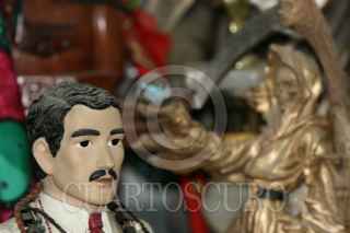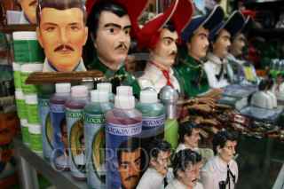 CULIACAN, SINALOA,.05JUNIO2008.- Jesús Malverde es un personaje del folclore del estado de Sinaloa, venerado como santo por muchos, Malverde es conocido como "El Bandido Generoso" o "El Ángel de los Pobres"; también se le conoce como "El Santo de los Narcos". En diversas historias cuentan que era una especie de Robin Hood. ya que robaba a los ricos para darselos a los pobres. Algunas personas afirman que su devocion ha crecido, en su capilla diariamente reciben visitas, donde le dejan , veladoras, dolares, cadenas de oro, brillantes, diamantes, y pertenencias personales de alto valor. es muy comun ver que diario por las tardes que algunos habitantes de Sinaloa le lleban tambora. Algunas peronas afirman que famosos narcotraficantes como Rafael Caro Quintero, Ernesto Fonseca, Miguel Angel Félix Gallardo y Amado Carrillo Fuentes han acudido a la capilla de Malverde. FOTO: SAUL LOPEZ/CUARTOSCURO.COM