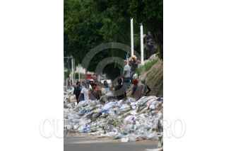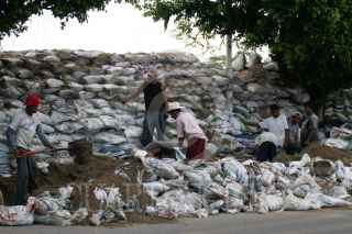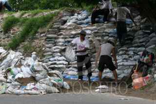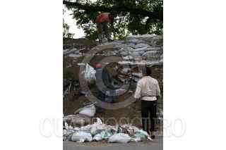 VILLAHERMOSA, TABASCO, 12JUNIO2008.- Varias decenas de obreros en su mayoría oriundos de Chiapas trabajan fuertemente en retirar las largas hileras de costales con arena sobre el malecón Leandro Rovirosa Wade. FOTO: MARCO POLO GUZMÁN HERNÁNDEZ/CUARTOSCURO.COM