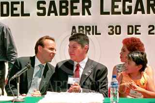 El Delegado de Miguel Hidalgo, Arne Aus Den Ruten Haag, el "Delegado por un Día", Cesar Augusto Nuñez González, y Joseline Basilio, Jefa delegacional por un día Honorario, durante la inaguración de la construcción del "Faro del Saber" en la colonia Legaria. FOTO: Juan Pablo Zamora/CUARTOSCURO.COM
