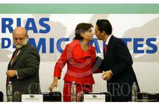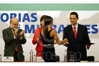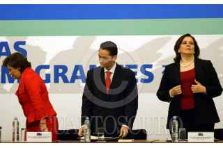 MÉXICO, D.F., 25JUNIO2008.- Patricia Espinosa, Secretaria de Relaciones Exteriores, Juan Camilo Mouriño, Secretario de Gobenación y Ana Teresa Aranda, Subsecretaría de Población, durante la entrega de los premios del concurso literario "Historias de Migrantes" alos ganadores en la diferentes categorias. FOTO: MOISÉS PABLO/CUARTOSCURO.COM