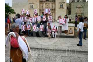 OAXACA , OAXACA 26JUNIO2008.-Con motivo del día internacional de las naciones unidas en apoyo de victimas de tortura. Organizaciones civiles encargadas de ayudar a diferentes sectores de la sociedad, se manifestaron día en la plaza de Santo domingo de Guzmán, donde con pancartas, pidieron la erradicación total de penas crueles, inhumanas y degradantes en Oaxaca. FOTO: MAX NÚÑEZ/CUARTOSCURO.COM