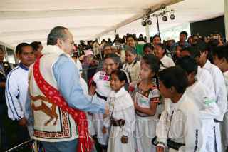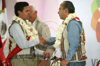 MUNICIPIO SAN FELIPE DEL PROGRESO., ESTADO DE MÉXICO 01JULIO2008 .- Felipe Calderon Presidente de México saluda a Entique Peña Nieto gobernador del Estado de México durante la inaguración de la carretera San Francisco Tlalchichipa - Rinconde los Pirules FOTO: ALFREDO GUERRERO/CUARTOSCURO.COM