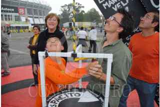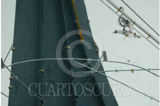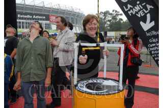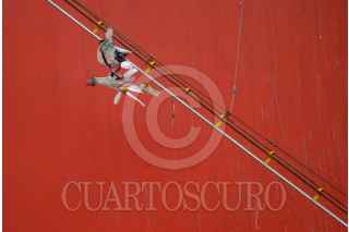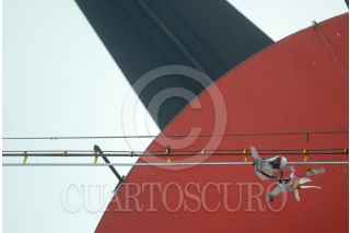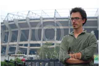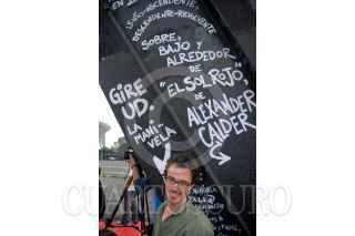MÉXICO D.F. 05JULIO2008.- El Artista Iker Vicente presentó su segunda intervención e interacción en el espacio urbano titulada "Donde las palomas hacen su nido" con la resignificación de la escultura "El Sol Rojo" de Alexander Calder, justo frente al estadio Azteca. FOTO: FELIPE CASTELLANOS/CUARTOSCURO.COM