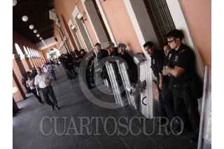 XALAPA, VERACRUZ 14 DE JULIO 2008. Elementos de seguridad resguardan las instalaciones del Palacio Municipal en espera de la marcha de donde integranes de diez organizaciones campesinas de Veracruz marcharon por la principal arteria de acceso a la ciudad capital, en demanda de distintas peticiones desde justicia juridica en el caso de los muertos de playa vicente, hasta la solicitud de un incremento real en los apoyos a proyectos agricolas y la renegociación del TLC, tambien se quejaron de represion de sus movimientos por parte del gobierno de estado. FOTO: JORGE VALDÉS/CUARTOSCURO.COM