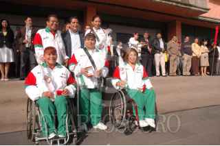 ECATEPEC, ESTADO DE MEXICO, 14JULIO2008.- El presidente municipal de Ecatepec, José Luis Gutiérrez Cureño, entregó la presea Siervo de la Nación y mil dólares para sus gastos en los Juegos Olímpicos de Beijin 2008 a los deportistas y atletas paraolímpicos ecatepenses participantes, tales como Patricia Retiz García, en 42 metros de atletismo; Jesús González, en los 50 kilómetros de marcha; Francisco Peláez en box, en la categoría de peso ligero de 60 kilogramos; Dora Elvia González Estrada y Adrián Paz Velásquez, en lanzamiento de bala, disco y jabalina, y las jugadoras de tenis de mesa María Teresa Arenales Huerta y María Paredes Albor. FOTO: MARIO NULO/CUARTOSCURO.COM