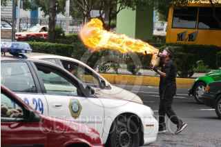 MÉXICO, D.F., 20JULIO2008.- Un lanza llamas en la avenida Río Churubusco, da su espectáculo frente a una patrulla de la misma delegación FOTO: RICARDO CASTELAN /CUARTOSCURO.COM