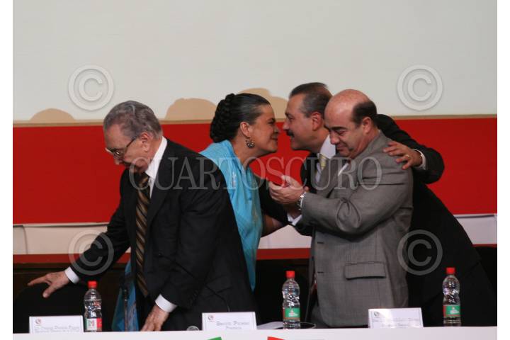 MÉXICO, D.F., 24JULIO2008.- Joaquín Gamboa Pascoe, dirigente de la CTM, Beatriz Paredes, dirigente nacional del PRI, Manlio Fabio Beltrones, coordinador de los senadores priistas y Jesús Murillo Karam, secretario general del partido, durante la sesión solemne de instalación de su Consejo Político Nacional, que se realizó en la sede central de la CTM. FOTO: MOISÉS PABLO/CUARTOSCURO.COM