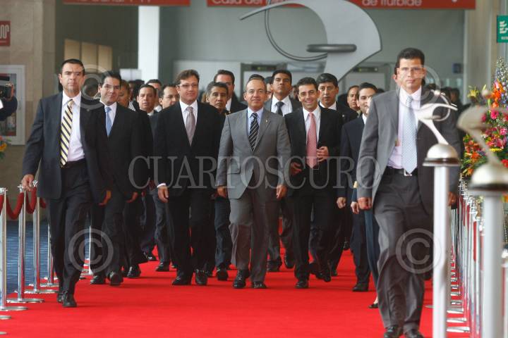 MÉXICO, D.F., 30JULIO2008.- Josefina Vazquez Mota, Luis Tellez, Marcos Achar, Felipe Calderón Hinojosa, juan Camilo Mouriño y Alberto Torrado durante el cambio de presidencia del Consejo de la Comunicación, realizado en el Centro Banamex. FOTO: SAÚL LÓPEZ/CUARTOSCURO.COM