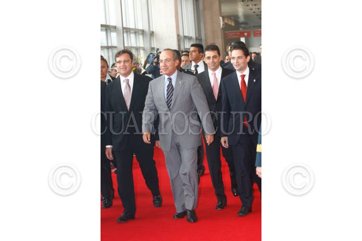 MÉXICO, D.F., 30JULIO2008.- Josefina Vazquez Mota, Luis Tellez, Marcos Achar, Felipe Calderón Hinojosa, juan Camilo Mouriño y Alberto Torrado durante el cambio de presidencia del Consejo de la Comunicación, realizado en el Centro Banamex. FOTO: SAÚL LÓPEZ/CUARTOSCURO.COM