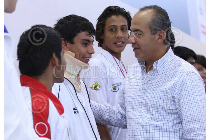 HERMOSILLO, SONORA 31 JULIO2008.-El presidente Felipe Calderón, saluda a Eduardo Bourns Gobernador de esta entidad durante la entrega de apoyos del Programa de Incentivos Para el Saneamiento de Aguas Residuales. FOTO: ALFREDO GUERRERO/CUARTOSCURO.COM