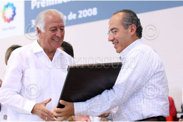 HERMOSILLO, SONORA 31 JULIO2008.-El presidente Felipe Calderón, saluda a Eduardo Bourns Gobernador de esta entidad durante la entrega de apoyos del Programa de Incentivos Para el Saneamiento de Aguas Residuales. FOTO: ALFREDO GUERRERO/CUARTOSCURO.COM