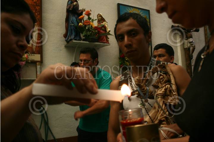 MÉXICO D.F., 01AGOSTO2008.- Como parte de las tradiciones que siguen los fieles a la santa muerte el primer día de cada mes celebran una misa en santuario de la Santa, ubicado en la calle de bravo, en Tepito oficiada por el arzobispo David Romo Guillén, donde decenas de fieles acuden a este lugar llevando en sus brazos a sus niñas blancas esperando que les sean cumplidos los favores pedidos, en esta ocasión en la ceremonia se pidió por el descanso del comandante Endoque Pantera fallecido la madrugada del jueves. FOTO: SÁSHENKA GUTIÉRREZ/CUARTOSCURO.COM