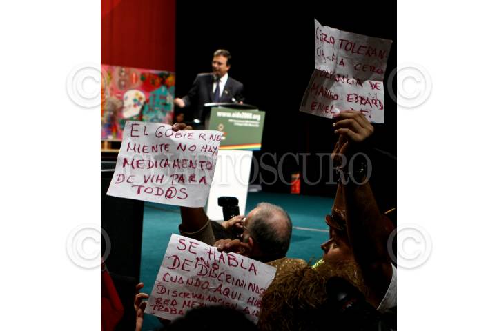 MÉXICO D.F., 08AGOSTO2008.- Trabajadoras sexuales mexicanas protestan con carteles durante la intervención del jefe de gobierno Marcelo Ebrard en la ceremonia de clausura dela XVII Conferencia Internacional sobre el SIDA que se realizo en el centro Banamex. FOTO: RODOLFO ANGULO/CUARTOSCURO.COM