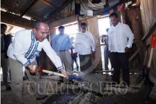 COMUNIDAD DE PLAN DE ARROYOS MUNICIPIO DE ATZALAN, VERACRUZ, 15AGOSTO2008.- Felipe Calderón Hinojosa, Presidente de México, acompañado con Fidel Herrera, gobernador de la entidad y Ernesto Cordero, Secretario de Desarrollo Social, realizó las primeras paladas con cemento en el marco del programa gubernamental "Pisos Firmes". FOTO: ALFREDO GUERRERO/CUARTOSCURO.COM