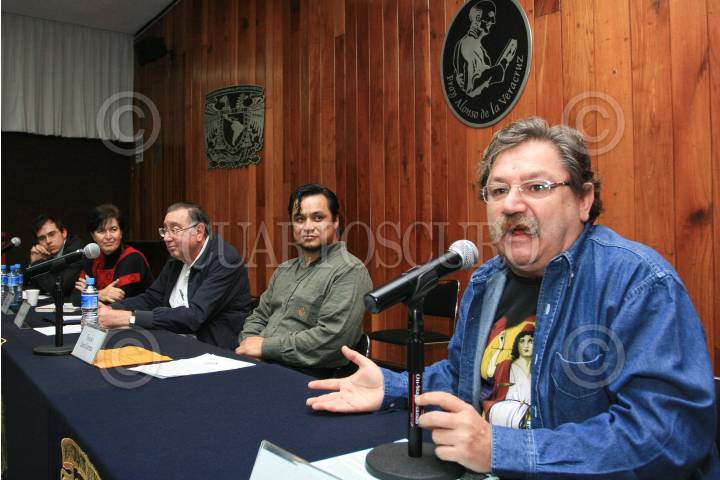 MÉXICO, D.F., 19AGOSTO2008.- El escritor Paco Ignacio Taibo II asistió a la conferencia de prensa que se realizó en la Facultad de Ciencias Políticas y Sociales con motivo de la próxima liberación de Héctor y Antonio Cerezo Contreras, quienes cumplen una condena de siete años bajo acusaciones de delincuencia organizada y posesión de armas y cartuchos de uso exclusivo del Ejército. FOTO: ISAAC ESQUIVEL/CUARTOSCURO.COM