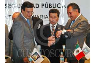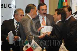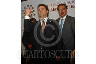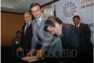 MÉXICO, D.F., 20AGOSTO2008.- El gobernador del estado de Baja California, José Guadalupe Osuna Millán; el jefe de gobierno del Distrito Federal, Marcelo Ebrard y el gobernador del estado de Sonora, Eduardo Bours durante la conferencia de prensa posterior a la reunión extraordinaria de la comisión de seguridad de la Conferencia Nacional de Gobernadores (CONAGO) que se realizo en un hotel de esta ciudad. FOTO: RODOLFO ANGULO/CUARTOSCURO.COM