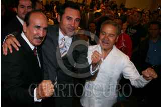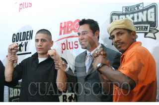 MÉXICO D.F., 26AGOSTO2008.- El boxeador estadunidense Oscar de la Hoya, posa con Armando Santa Cruz y Antonio Pitalúa, quienes protagonizarán la primera función de box del reality Next Boxing Generation y que se realizará en la Arena Coliseo de Monterrey. Las transmisiones que serán televisadas por la cadena de televisión HBO comenzarán a partir de el mes de Septiembre según lo señalaron los directivos de la cadena televisiva en una conferencia de prensa que conto con la presencia de grandes figuras del boxeo mexicano. FOTO: MOISÉS PABLO/CUARTOSCURO.COM