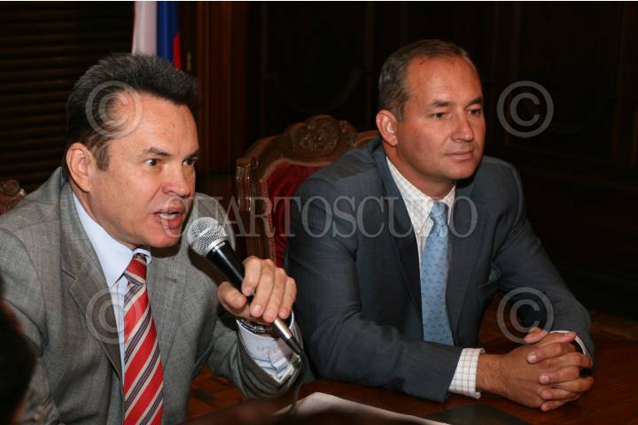 MÉXICO D.F., 27AGOSTO2008.- Vleriy Pogrushevsky encargado de negocios de la embajada Rusa en nuestro país y acompañado de Vladimir Yoroshevsky agregado de prensa, durante su conferencia de prensa en donde dieron a conocer la situación conflicto bélico que se vive en Osetia. FOTO: GUILLERMO PEREA/CUARTOSCURO.COM