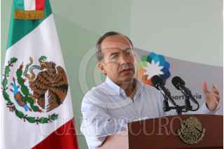 ENSENADA BAJA CALIFORNIA, 28 AGOSTO2008.- Felipe Calderon Presidente de México acompañado por el Gobernador del estado Hécto Ozuna y Luis Tellez secretario de comunicaciones y trasportes, durante el anuncio del lanzamiento de la licitacióndel proyecto de la licitación del proyecto multimodal " Punta Colonet" FOTO: ALFREDO GUERRERO/CUARTOSCURO.COM