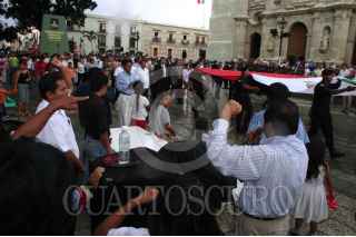 OAXACA, OAXACA 01SEPTIEMBRE2008.-Militantes de la APPO gritan consignas a los funcionarios que pasan escoltando la bandera entre ellos el secretario de gobierno Manuel García Corpus donde solo se suscitaron enfrentamientos verbales entre ambos bandos FOTO: MAX NÚÑEZ/CUARTOSCURO.COM