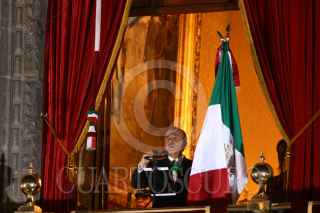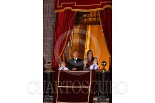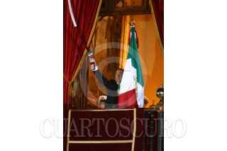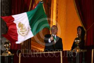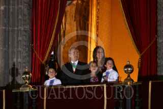 MÉXICO D.F.,15SEPTIEMBRE008.- Ante miles de mexicanos, el Presidente de México Felipe Calderón ondeo la bandera nacional y tocó la campana de Dolores acompañado por su familia ,desde el balcón central de Palacio Nacional, al conmemorar el 198 aniversario del inicio de la Independencia. FOTO: SÁSHENKA GUTIÉRREZ/CUARTOSCURO.COM