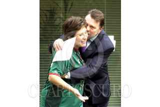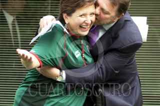 Xochitl Gálvez, encargada de la oficina para Asuntos Indigenas de la Presidencia y Jorge G. Castañeda, secretario de Relaciones Exteriores festejan emocionados el triunfo de la Selección Nacional, en el jardín de la la residencia oficial de los Pinos. FOTO: Oswaldo Ramírez/CUARTOSCURO.COM
