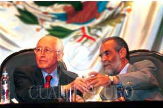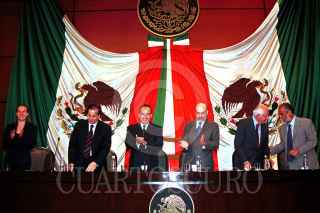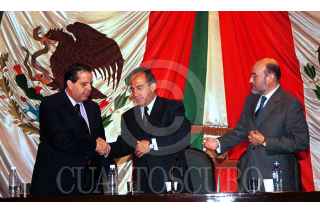 Guntenberg Martínez, Felipe calderón Hinojosa y Luis Felipe Bravo Mena, al término del Seminario "Estado y Políticas Públicas, Una visión Latinoamericana", que se realizó en la Cámara de Diputados. FOTO: Juan Pablo Zamora/CUARTOSCURO.COM