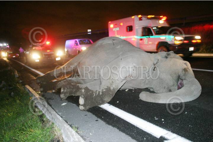 ECATEPEC, ESTADO DE MEXICO 23SEPTIEMBRE2008.- Esta madrugada un elefante que escapo de las bodegas del circo Union, murio al ser embestido por un autobus de la linea México Teotihuacan en el kilómetro 1 de la autopista México-Piramides, dejando como saldo, el conductor del autobus de nombre; Tomas López Duran y el elefante muerto por el impacto.En la imágen, cuerpos de rescate tratando de sacar el cuerpo del conductor prensado. FOTO: LUZ ACEVEDO/CUARTOSCURO.COM